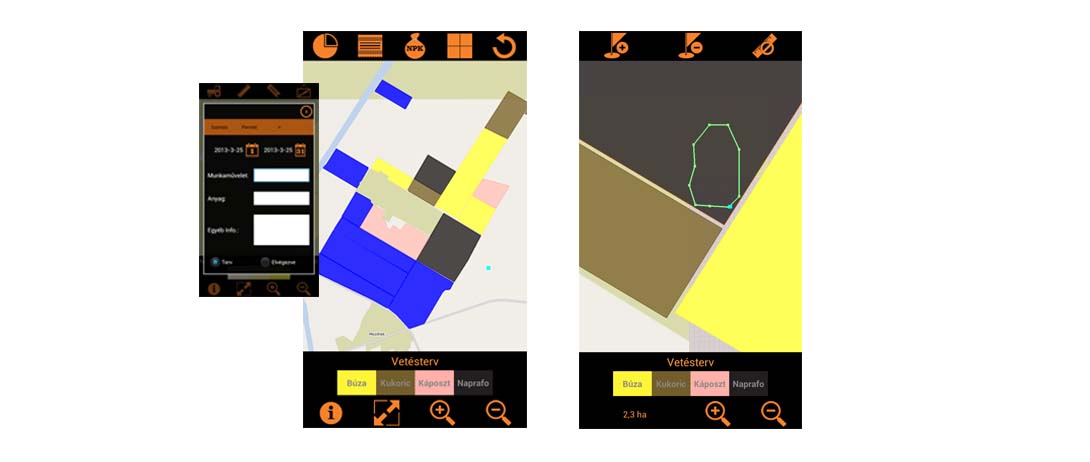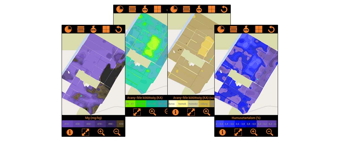 Az AgroMobil terepi szoftverünkben elérhetővé tesszük az asztali szoftverben is megtalálható tematikus térképeket, legyen az akár tápanyagtérkép, vagy az asztali szoftveren kiszámított trágyázási szaktanács, vagy csak egyszerűen a vetésterv térképe a táblákra vonatkozó alapinformációkkal.